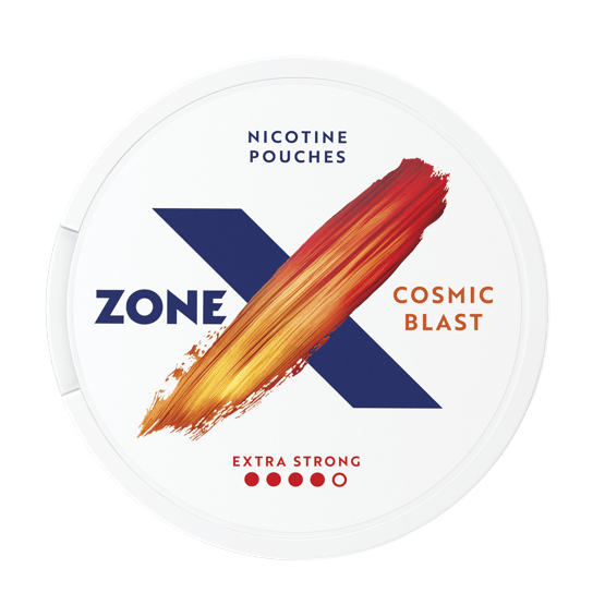 ZONE X Cosmic Blast Extra Strong Slim – Has a taste of tropical fruits with a hint of citrus and a dash of wasabi. A nicotine pouch with a zing for sure! This flavor combination captures the summer – all year round. The chalk-white portions provide a long-lasting experience that does not discolour the teeth.